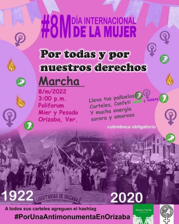 Orizaba, Ver.- A trece días de Conmemorarse el Día Internacional de la Mujer “8M”, el Colectivo feminista Cihuatlatolli y la Colectiva Marea Verde Altas Montañas, anunciaron una marcha para llevarse a cabo el martes 8 de marzo por las principales calles de la Ciudad de Orizaba, la cual este año tendrá tres ejes principales de lucha en la Pluviosilla; la defensa de la violencia contra las mujeres, la instalación de la antimonumenta en un espacio digno y la celebración propia de la fecha.