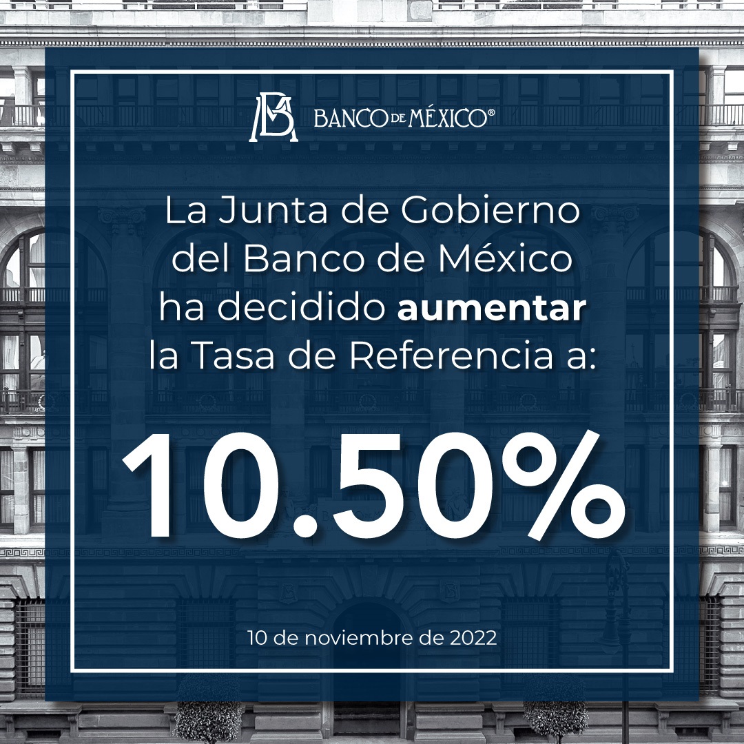 “La Junta de Gobierno del Banco de México decidió incrementar en 50 puntos base el objetivo para la Tasa de Interés Interbancaria a un día a un nivel de 10.50%, con efectos a partir del 16 de diciembre de 2022”, informó Banxico.