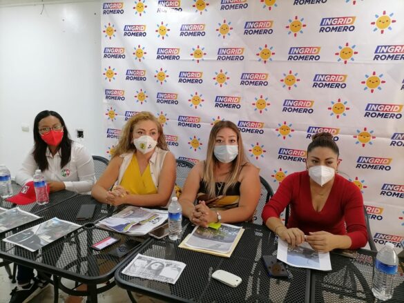 En rueda de prensa Lorena Rosas Sánchez, coordinadora de campaña de Ingrid Romero García; la candidata a regidora primera por la planilla del PRD, Elda Quintero Mármol; Leslie Margarita González, Elizabeth Bocanegra y el coordinador del equipo Josué Andrade Bicanegra.